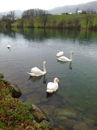 Ich habe sie gegrüsst und ihnen gesagt wie wunderschön und majestätisch sie doch aussehen würden. Als ich sie gebeten habe ihre schönen Flügel aufzustellen, haben sie es tatsächlich für mich gemacht und das mehr als einmal. Und als sie da so waren....auf dem Weg zur Emme....habe ich ihnen gesagt, dass ich jetzt weitergehen würde, aber Richtung Solothurn. Da haben alle die Richtung gewechselt und sind neben mir her wieder Richtung Solothurn geschwommen. Irgendwann habe ich mich bei ihnen bedankt für ihre Begleitung. Ich teilte ihnen mit, dass sie schon ihres Weges gehen dürfen. Sie haben gemeint, dass es ihnen eine Ehre war, mich ein Stück zu begleiten. Und eben der eine hat immer geredet und als ich sie schon nicht mehr sah, habe ich ihn noch immer gehört.